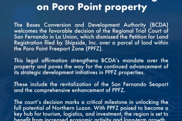 The Bases Conversion and Development Authority (BCDA) welcomes the favorable decision of the...